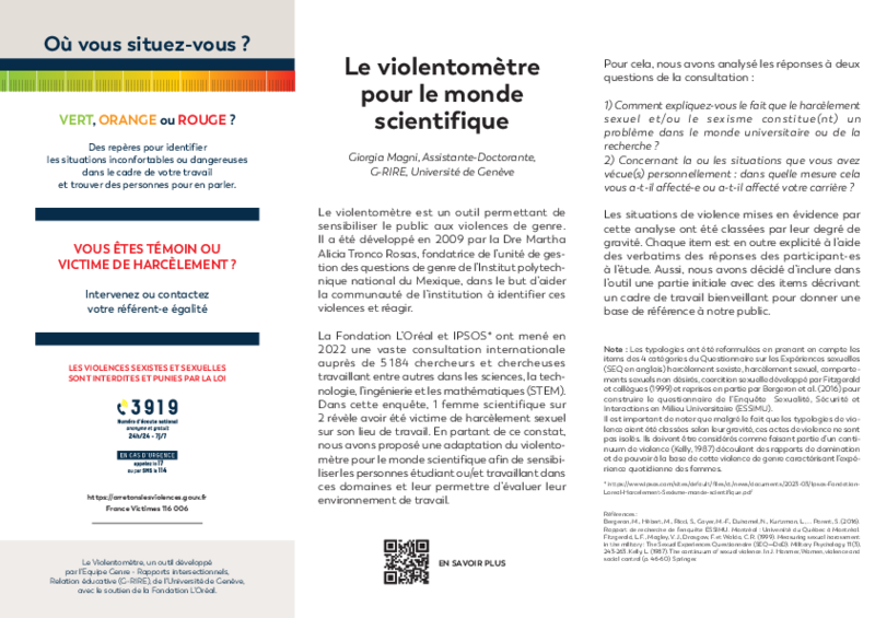 Il n'est parfois pas évident de repérer ou de légitimer des situations pour lesquelles une violence existe. Pour cela, un violentomètre adapté au monde de la recherche a été édité. Celui-ci vous permettra d'évaluer des situations auxquelles vous avez peut être été confronté.e.s. N'hésitez pas à le communiquer autour de vous, ainsi qu'à l'afficher dans votre espace de travail.